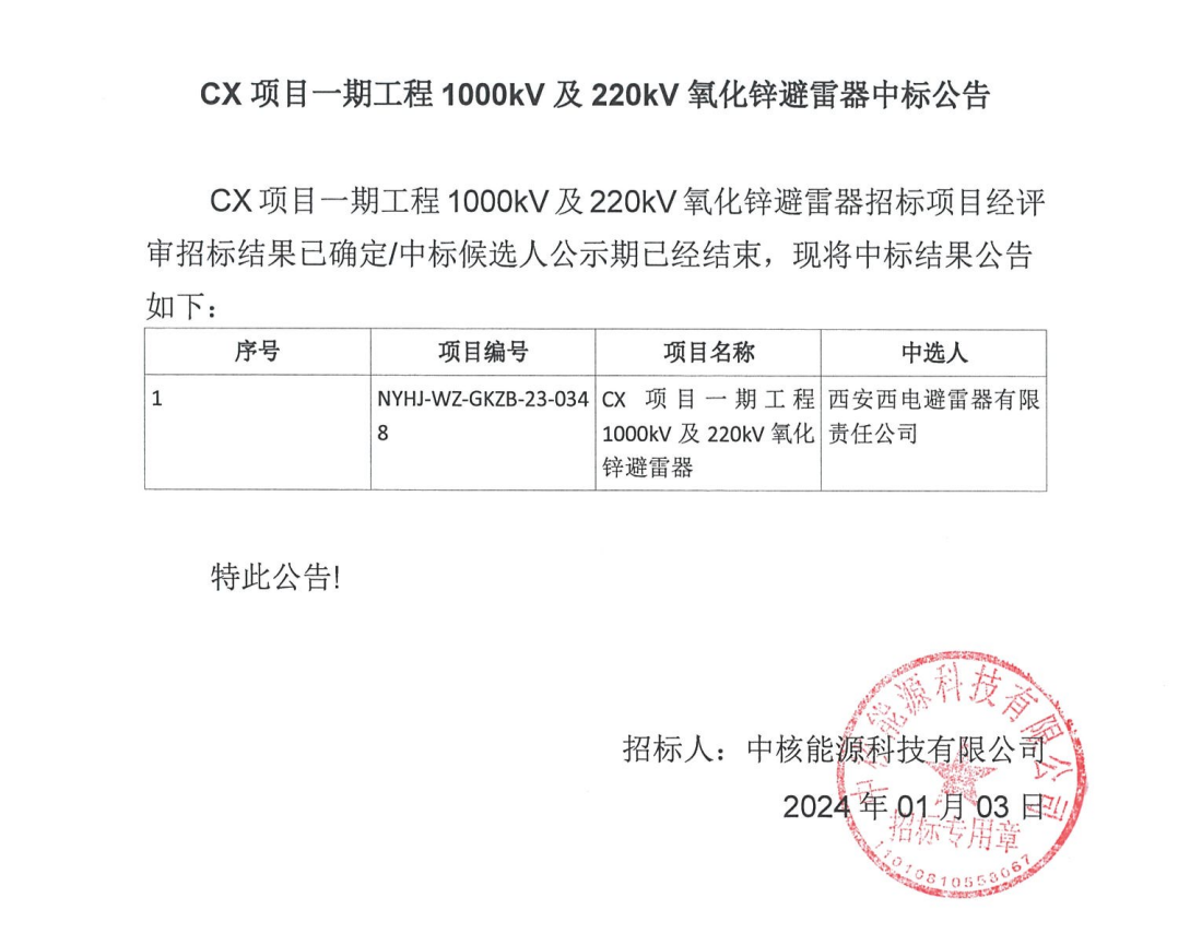 据中国核工业集团有限公司电子采购平台1月3日中标结果公告,开云足球体育app中国有限公司已被确认为CX项目一期工程1000kV及220kV氧化锌避雷器中标人,中标金额2102.07万。